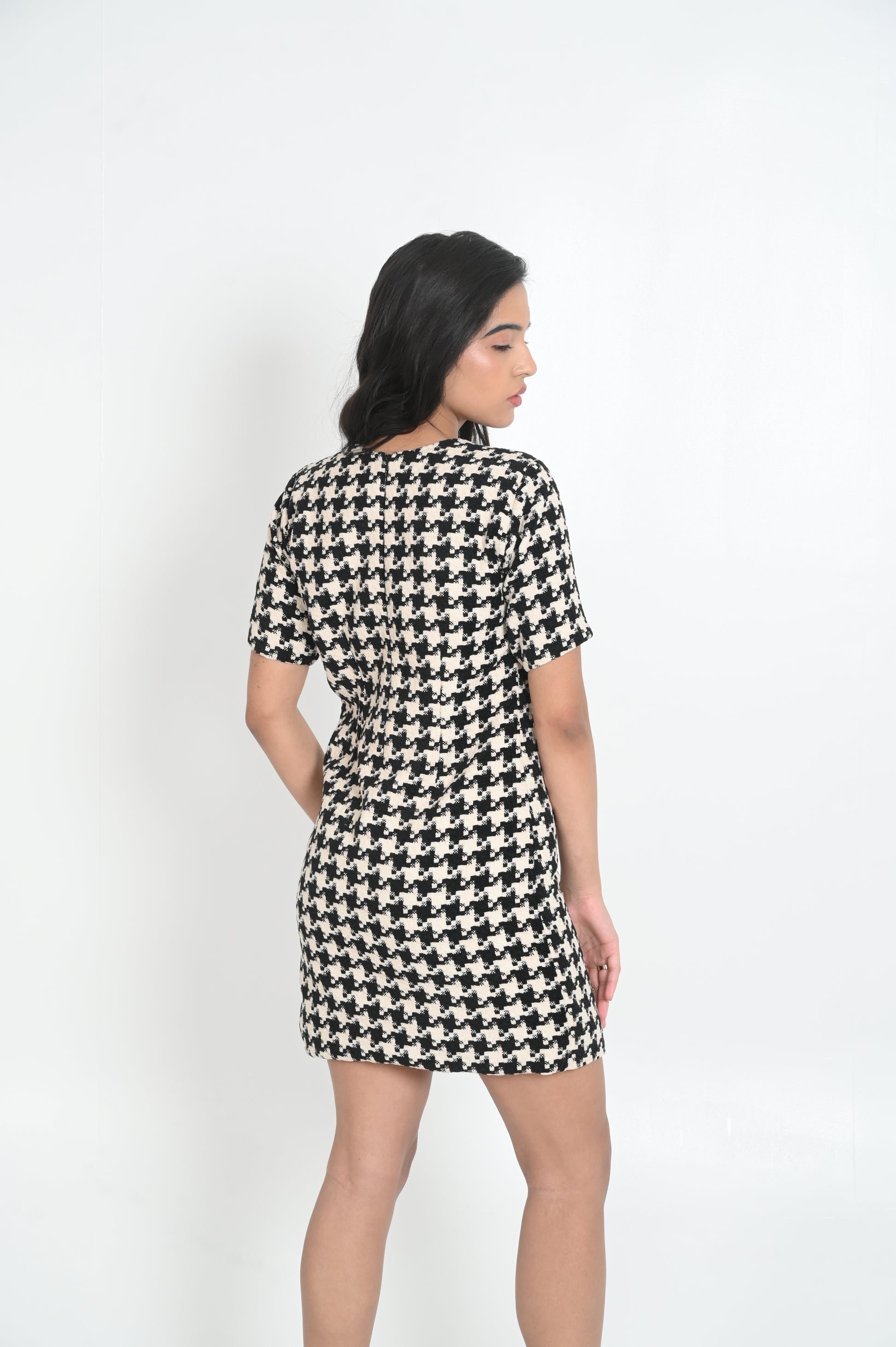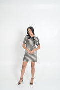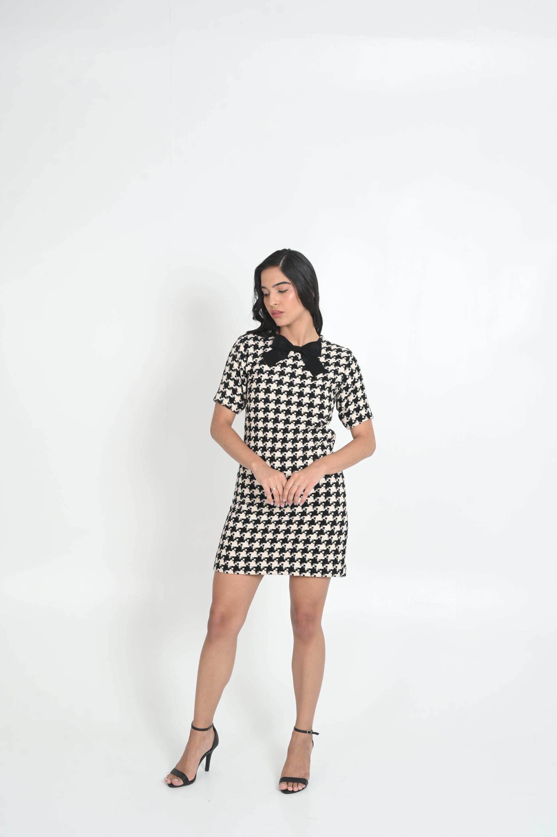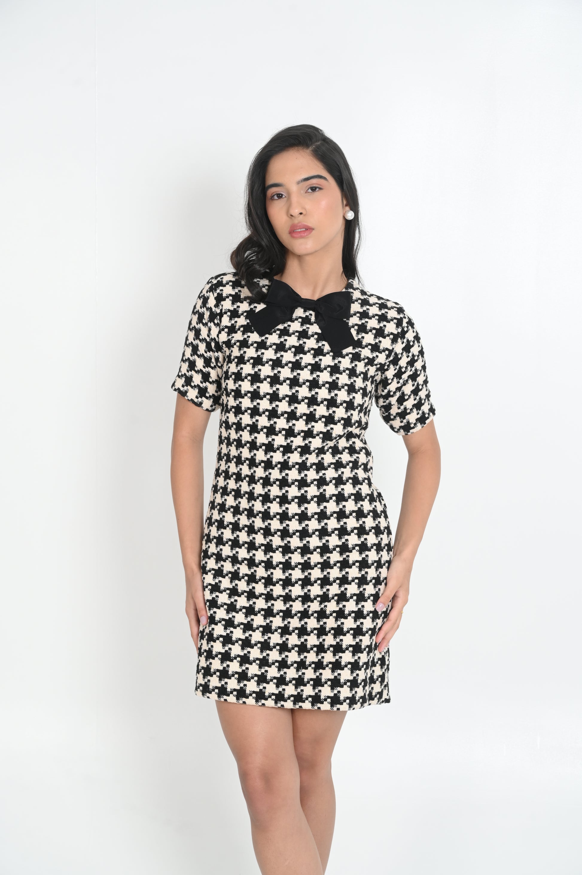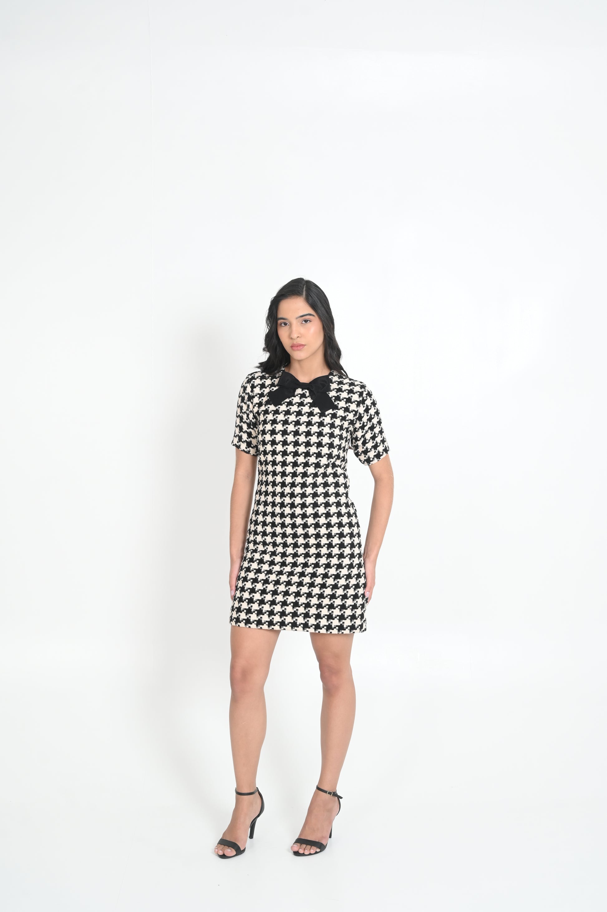 Crafted in a luxurious houndstooth jacquard with a smooth inner lining, this dress offers the perfect blend of structure and comfort. The classic bodycon silhouette flatters effortlessly, while the statement bow neckline adds a refined, feminine touch.
