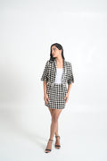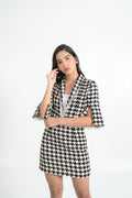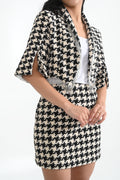 A chic houndstooth co-ord crafted for effortless sophistication. The cropped open-front jacket pairs seamlessly with the tailored mini skirt, creating a polished, modern silhouette. Versatile, structured, and statement-worthy — perfect for work, evenings out, or elevated everyday style.