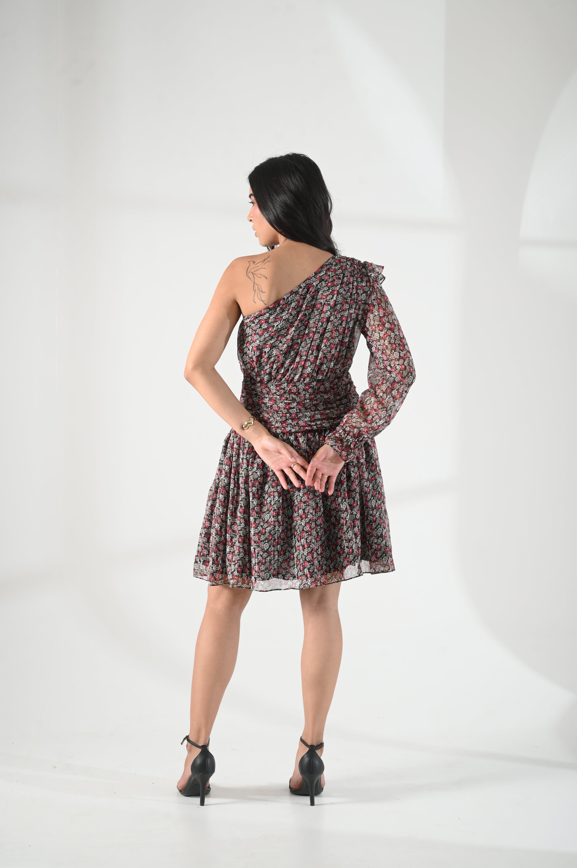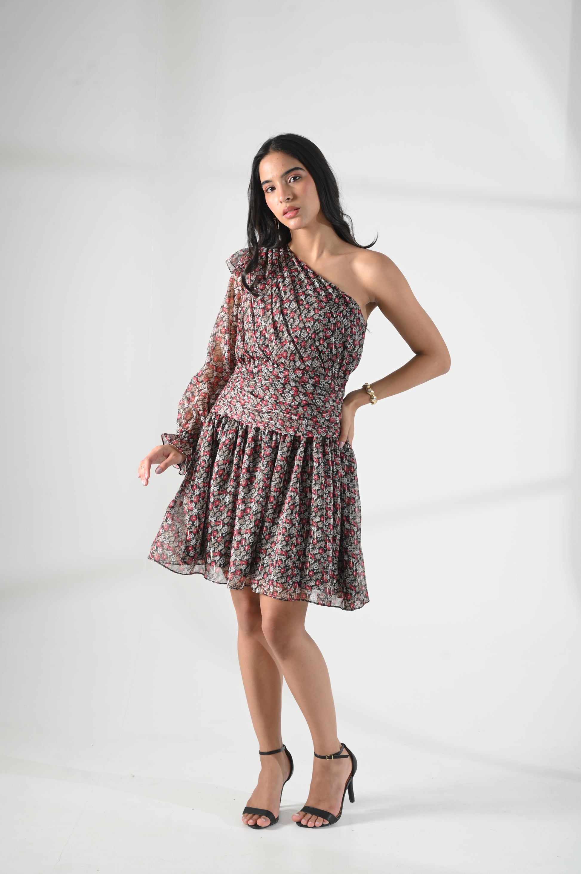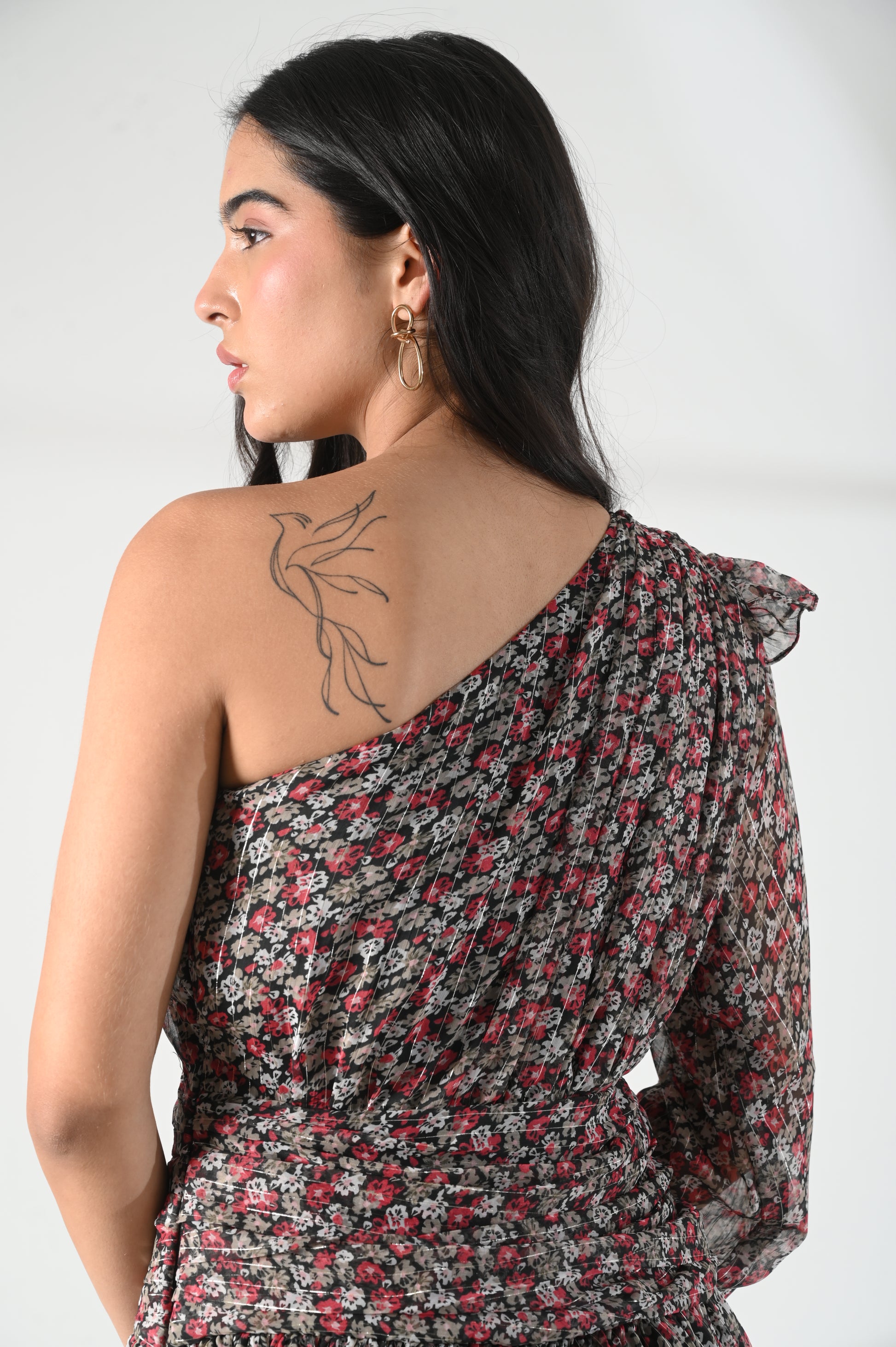 Crafted from premium luxe chiffon with soft lining — ensuring nothing sheer, only comfort and grace. The asymmetric one-shoulder silhouette adds a modern twist to timeless florals, capturing the quiet romance of fall.