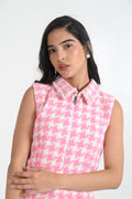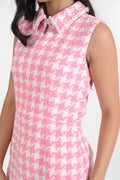 The ultimate sophisticated mini. This tailored pink-and-white check dress features a crisp, embellished collar and a structured silhouette designed to flatter the figure. Perfect for everything from polished office wear to upscale brunch dates.