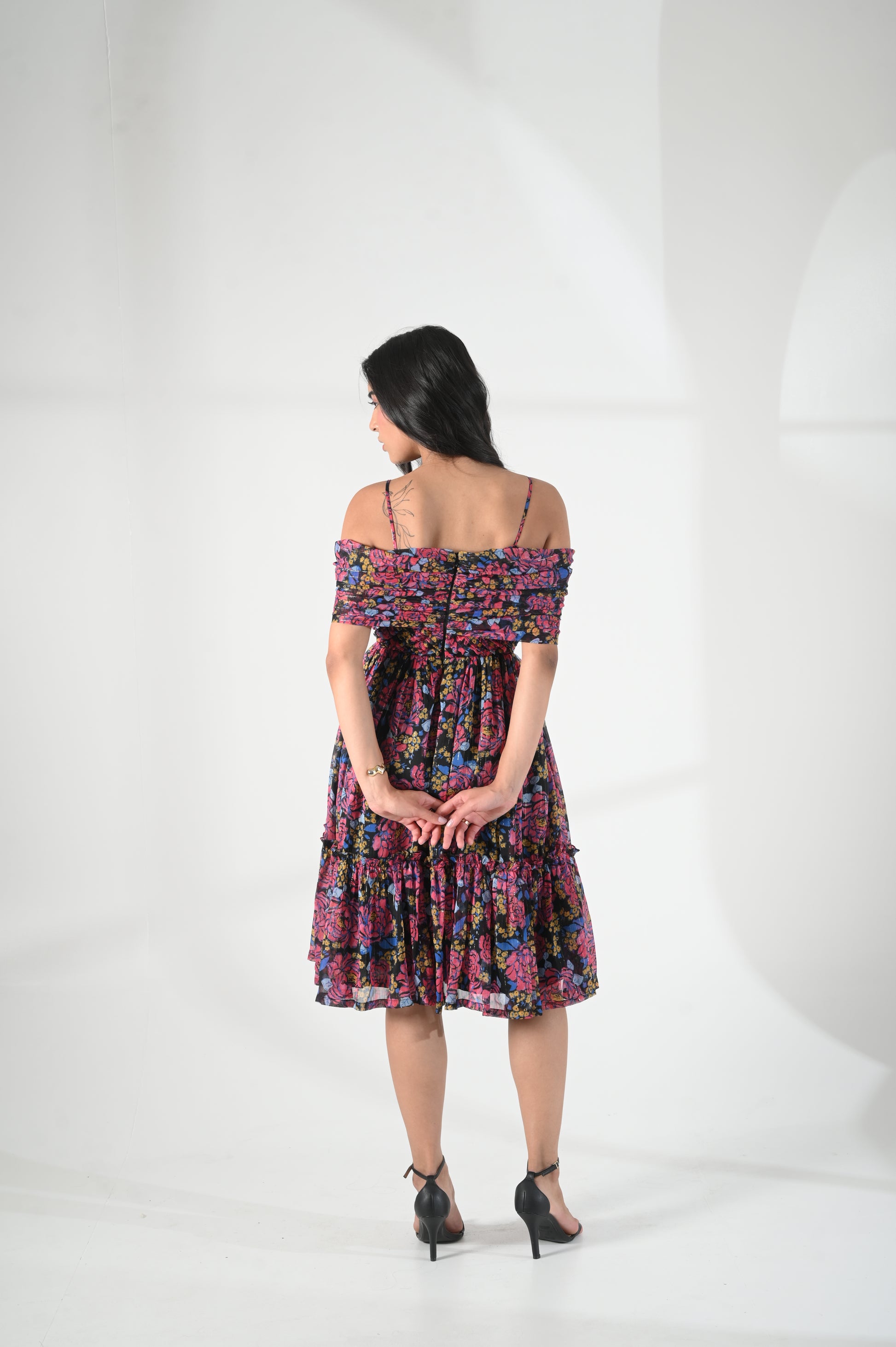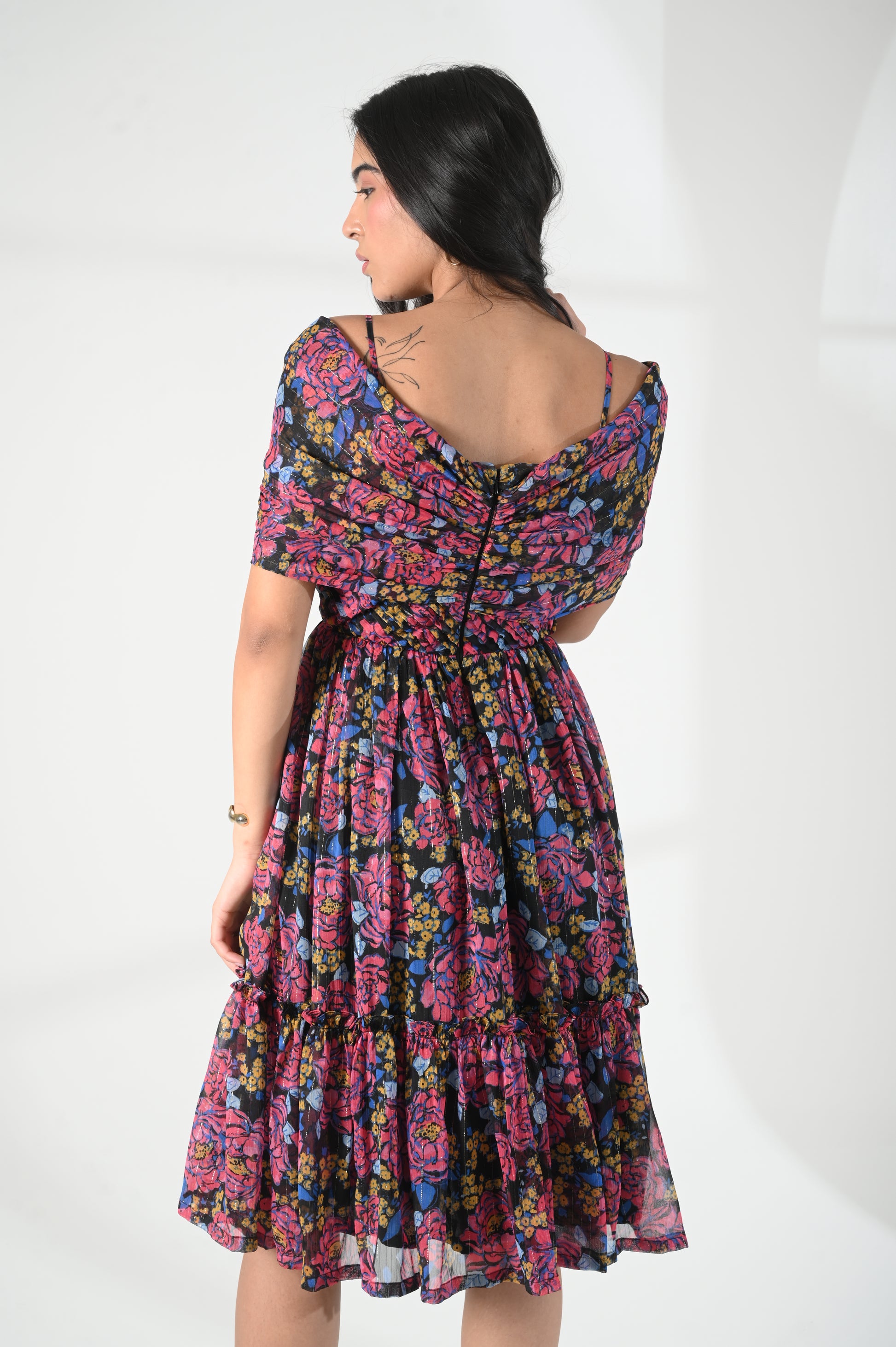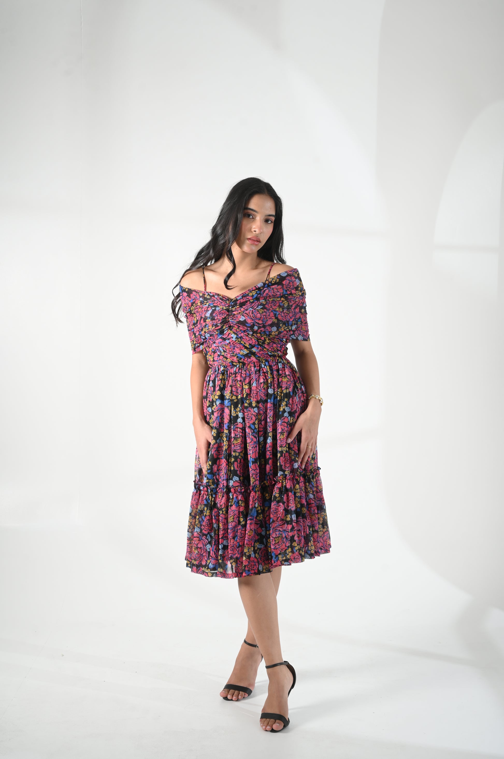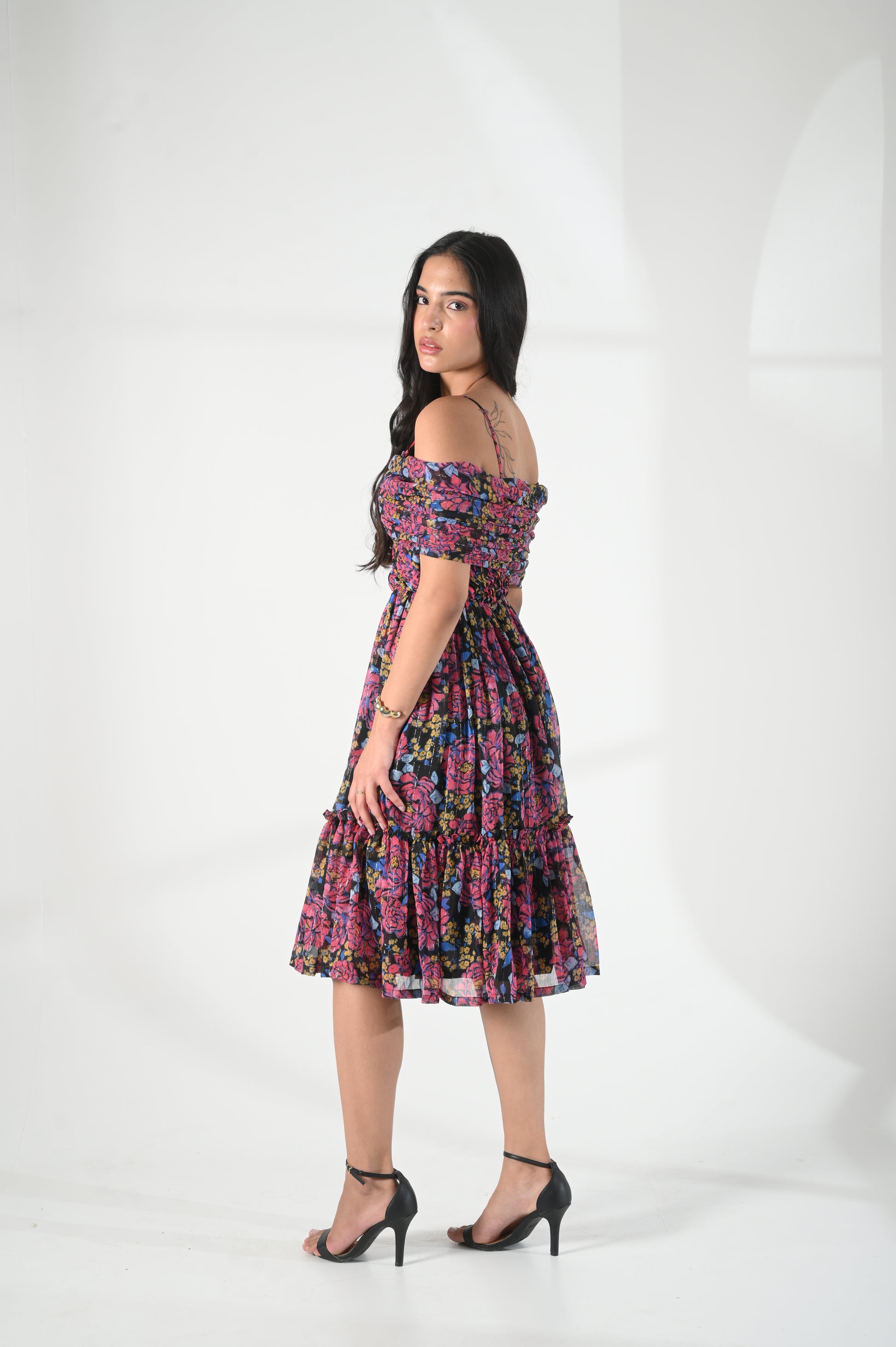 Crafted in high-quality premium luxe chiffon with full lining, this dress ensures a soft, non-transparent finish and graceful fall. Designed with delicate floral patterns inspired by autumn’s fading roses, it captures the romance of twilight hues. The flowy silhouette and dreamy texture make it perfect for cozy evenings or festive gatherings.
